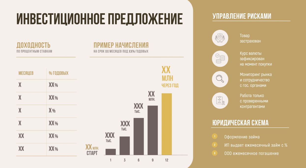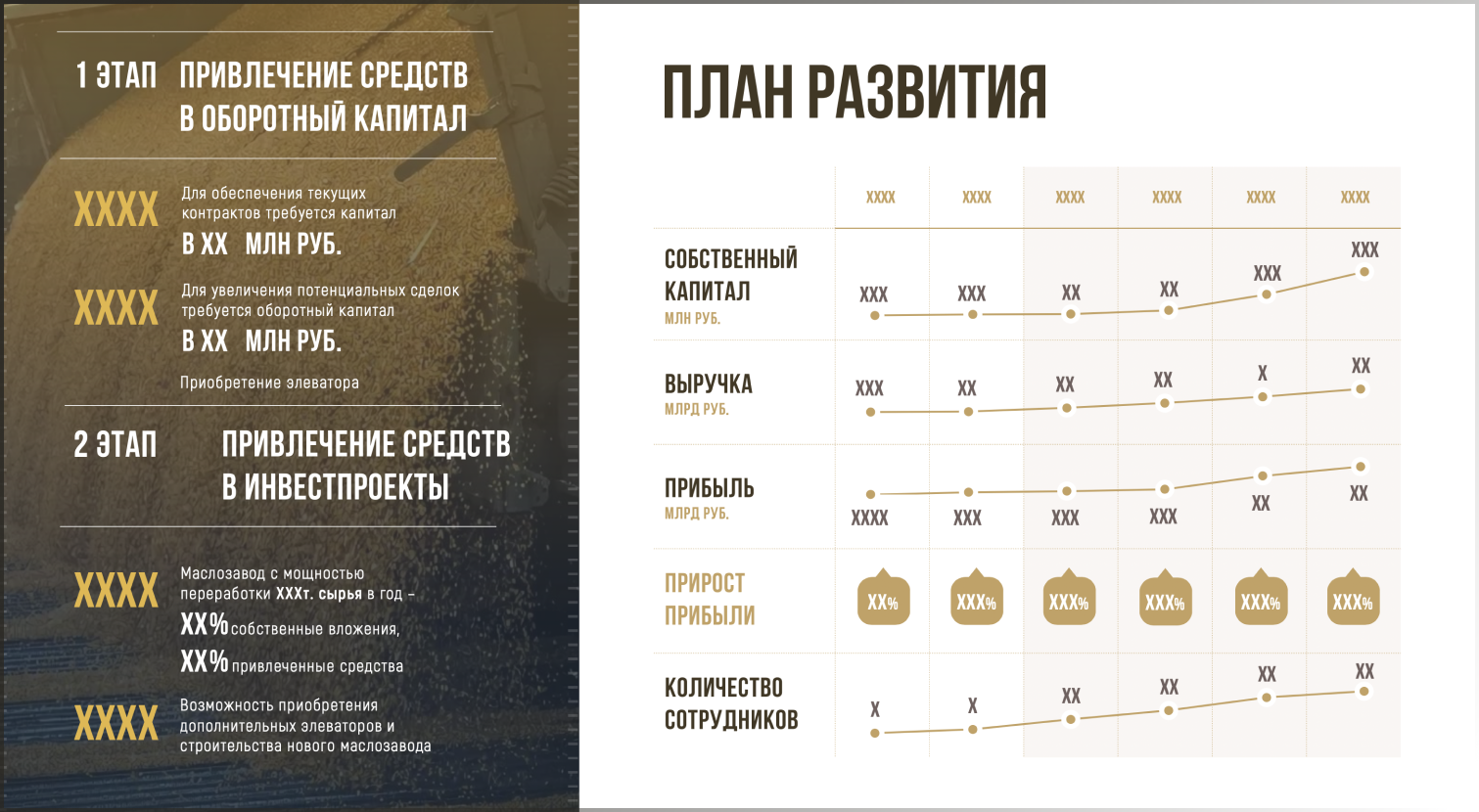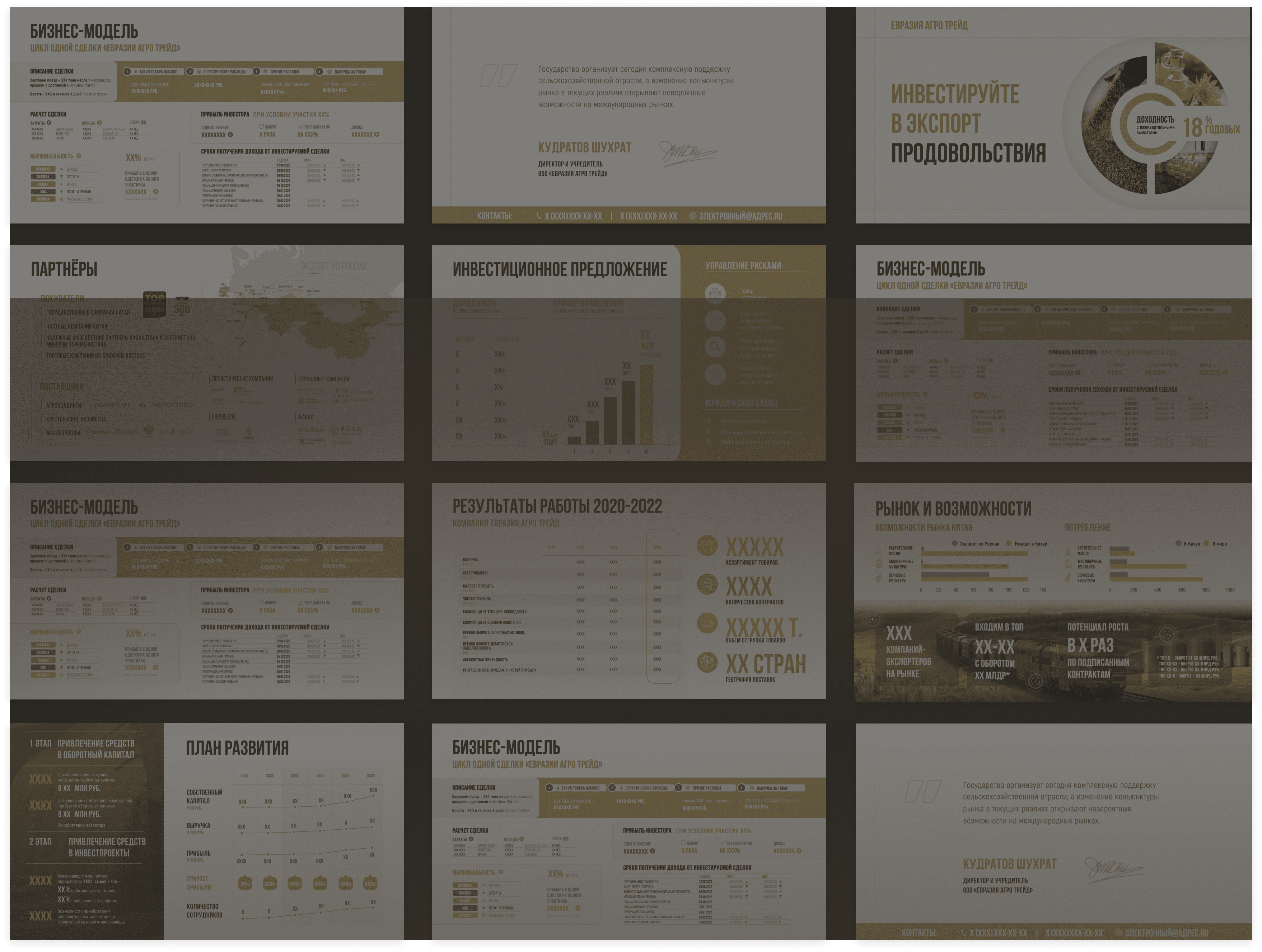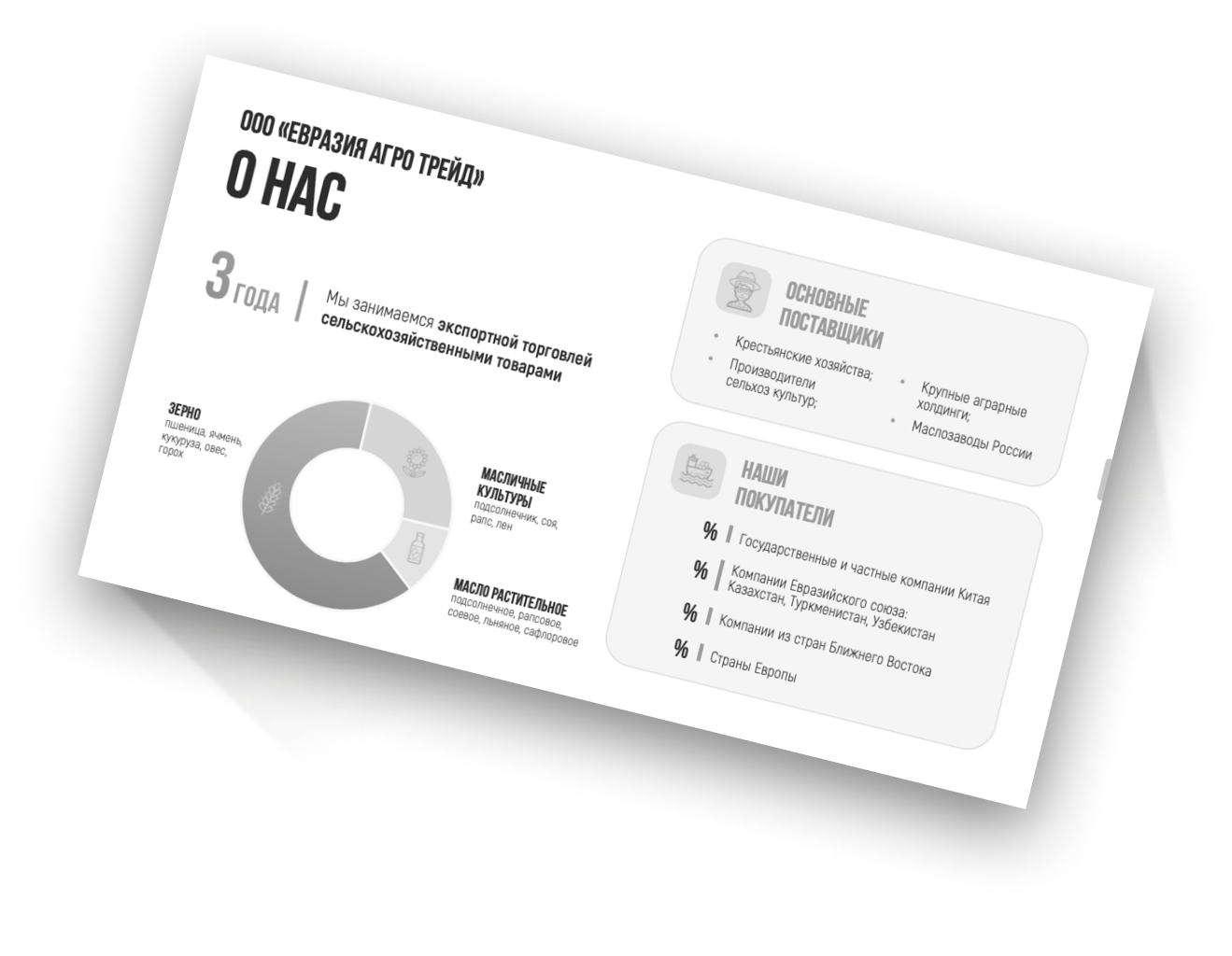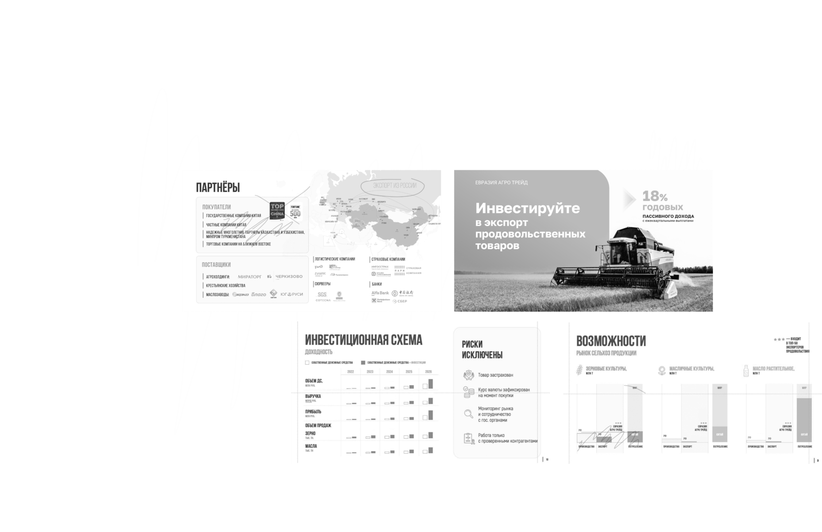 Мы продумали послайдовый сценарий чтения презентации: от знакомства с тенденциями рынка экспорта сельскохозяйственных товаров, последовательно перешли к финансовым планам компании Евразии Агро Трейд и их инвестиционному предложению. Раскрыли в цифрах основные показатели, которые помогут принять читателю положительное решение.