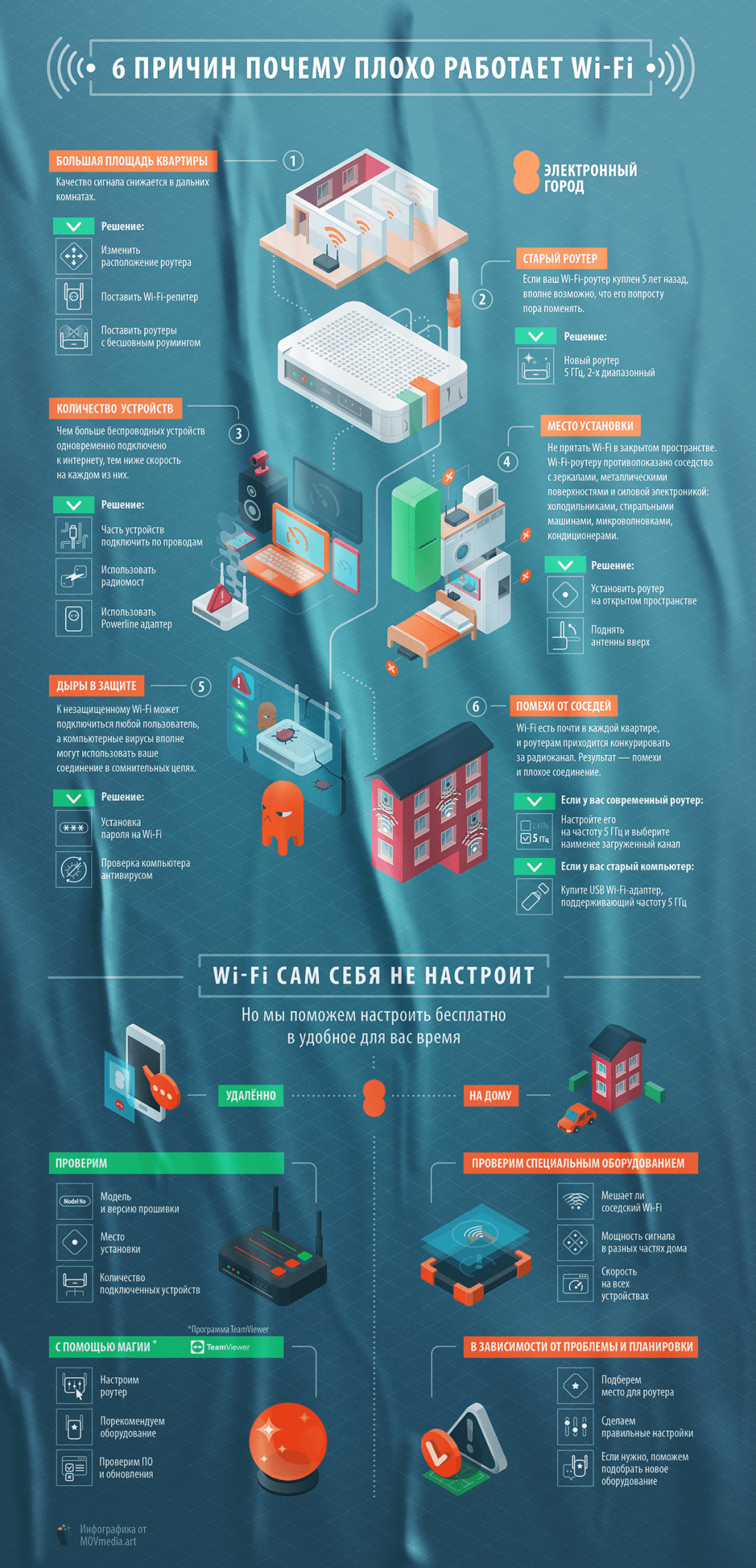 Мы подробно изучили причины, которые могут влиять на сигнал Wi-Fi. В центре показали визуальные образы основных причины плохой работы роутера.